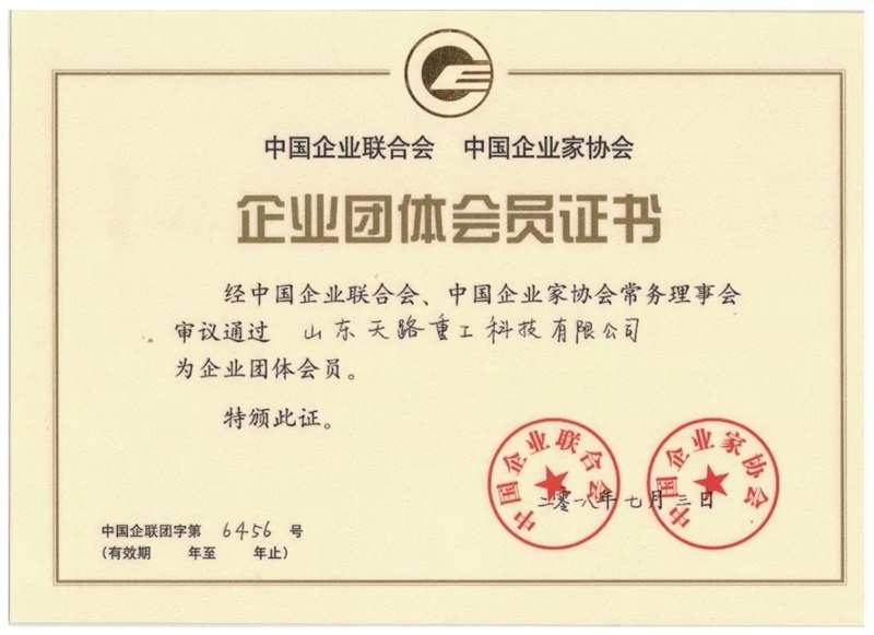 近日,天路重工被授予“中國(guó)企業(yè)聯(lián)合會(huì)、中國(guó)企業(yè)家協(xié)會(huì)”企業(yè)團(tuán)體會(huì)員證書,正式成為中國(guó)企聯(lián)的一員。