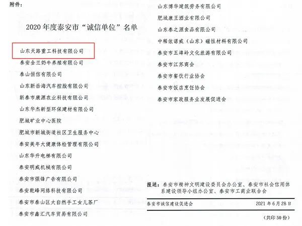 經(jīng)過(guò)嚴(yán)格審核,山東天路重工科技有限公司等二十幾家企業(yè)被評(píng)為2020年度泰安市首屆“誠(chéng)信單位”。